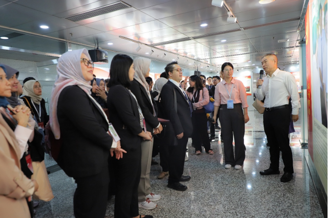 当日上午,研修班一行抵达位于顺义区的北京中德产业园。在中德大厦一层展厅,学员们观看了《北京中德产业园》宣传片,并结合沙盘模型听取了园区规划建设、产业生态、国际合作机制等方面的情况介绍。启迪中德园的讲解人员分别就园区发展现状、政策支持、企业服务等内容进行详细讲解。随后,印尼学员对于园区运营模式、外资企业入驻政策、技术创新合作等方面踊跃提问,现场交流气氛热烈。